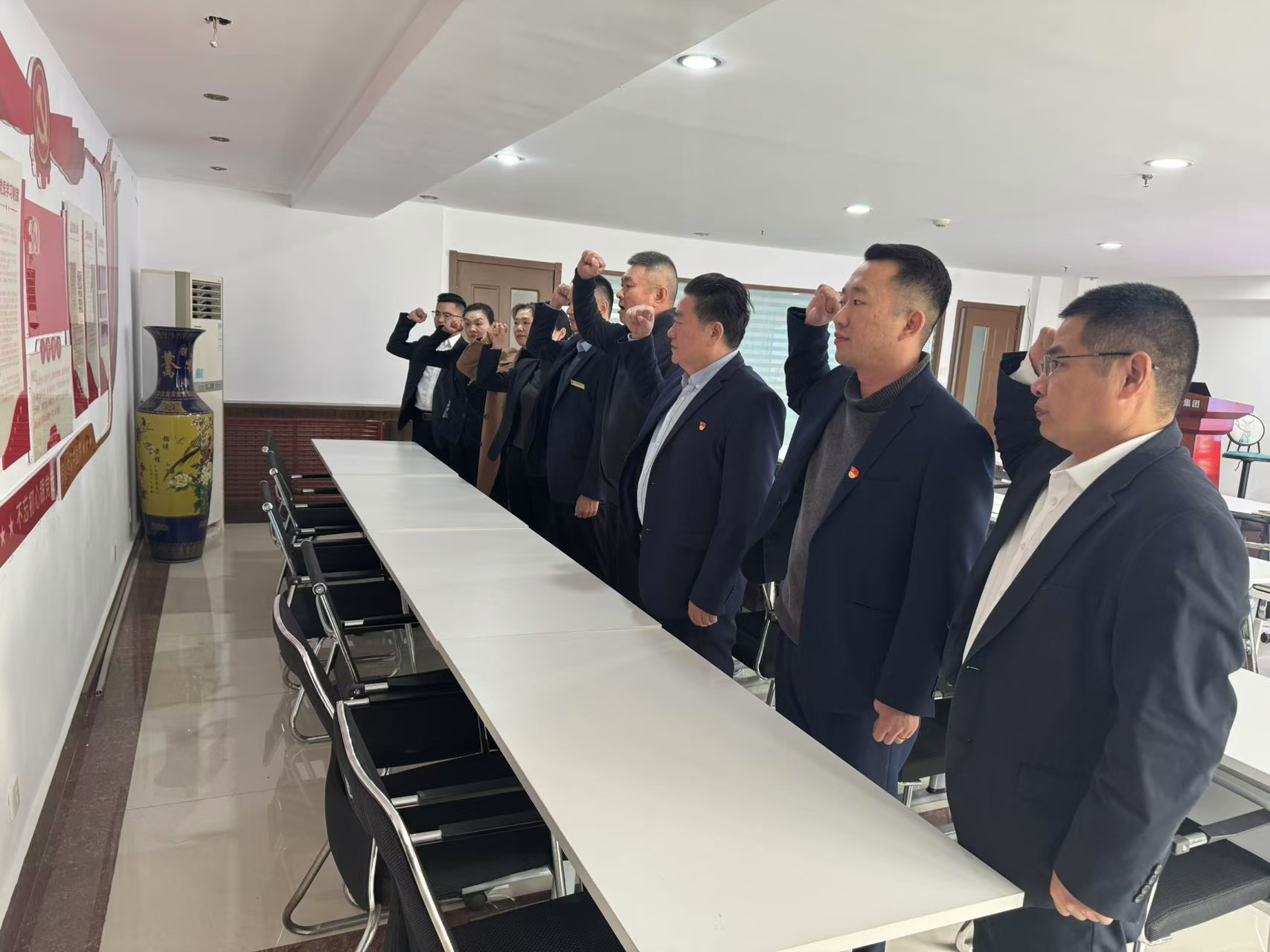 會議第一項,由黨支部現(xiàn)任書記趙賢峰同志和前任書記種加祥同志共同帶領(lǐng)參會人員面對黨旗,莊嚴(yán)地高舉右拳,齊聲誦讀入黨誓詞,“我志愿加入中國共產(chǎn)黨,擁護(hù)黨的綱領(lǐng),遵守黨的章程……”,重溫自己對黨忠誠的誓言。通過宣誓,再次堅定了黨員同志和積極分子對黨的信仰。
